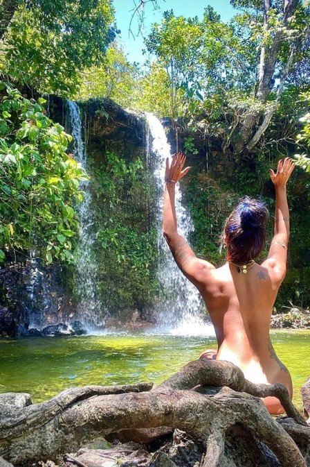 De férias no Jalapão com o filho Nathan, de 9 anos, Aline Riscado compartilhou na manhã desta terça-feira uma foto completamente nua em meio a natureza, numa cachoeira. "Liberdade, conexão, paz e gratidão", escreveu a bailarina e atriz na legenda da publicação compartilhada em seu Instagram. Riscado aproveitou ainda para fazer um agradecimento ao ano de 2019: