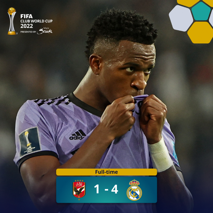 Aos 19 minutos o Al Ahly ainda descontou em gol em cobrança de pênalti de Maaloul, mas a equipe espanhola marcou mais duas vezes (com Rodrygo aos 46 e Arribas aos 52) para confirmar a vaga na grande decisão.