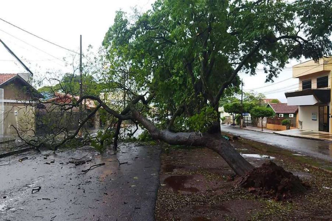 Chuva e ventos fortes derrubam árvores e causam estragos na cidade e em posto da PRF